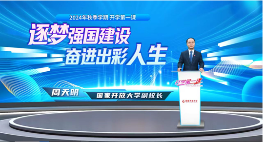 周天明分享了新时代青年一代面临的时代要求和历史责任,阐释了国家开放大学敬学广惠,助力人人出彩的担当使命,号召国开学子不负韶华,用自强不息书写奋进人生。他回顾了国家开放大学办学45年来的重要历史贡献,展望了未来学校将努力建成中国特色世界一流开放大学的发展目标。他鼓励国开学子将个人的梦想融入国家的发展大局,秉持终身学习的理念,不断追求自我提升与超越;倡导国开学子要努力锻造核心素养,树立远大理想、秉持终身学习之志、深耕专业技能、提升数字素养、涵养艺术素养、激发创新创业之力、守护心理健康,并向大家提出求学建议。